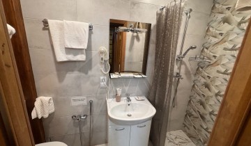 Комфортный Семейный номер в деревянном коттедже с двуспальной и полутороспальной кроватью, камином, многоканальным телевидением и мини-баром (не входит в стоимость номера). В ванной комнате расположены: удобная душевая кабина и туалетные принадлежности.